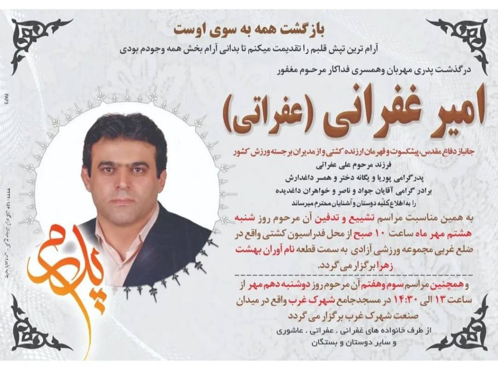 ️ امیر غفرانی (عفراتی) انسانی وارسته پهلوانی از دیار پهلوانان استاد ادب ومعرفت پیشکسوت ورزش کشور ( عضو اسبق تیم ملی، نایب رئیس اسبق فدراسیون کشتی و مدیرکل اسبق ورزش و جوانان استان البرز ) دار فانی را وداع گفت.